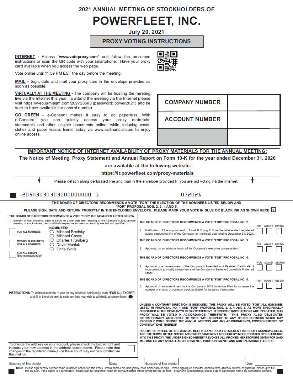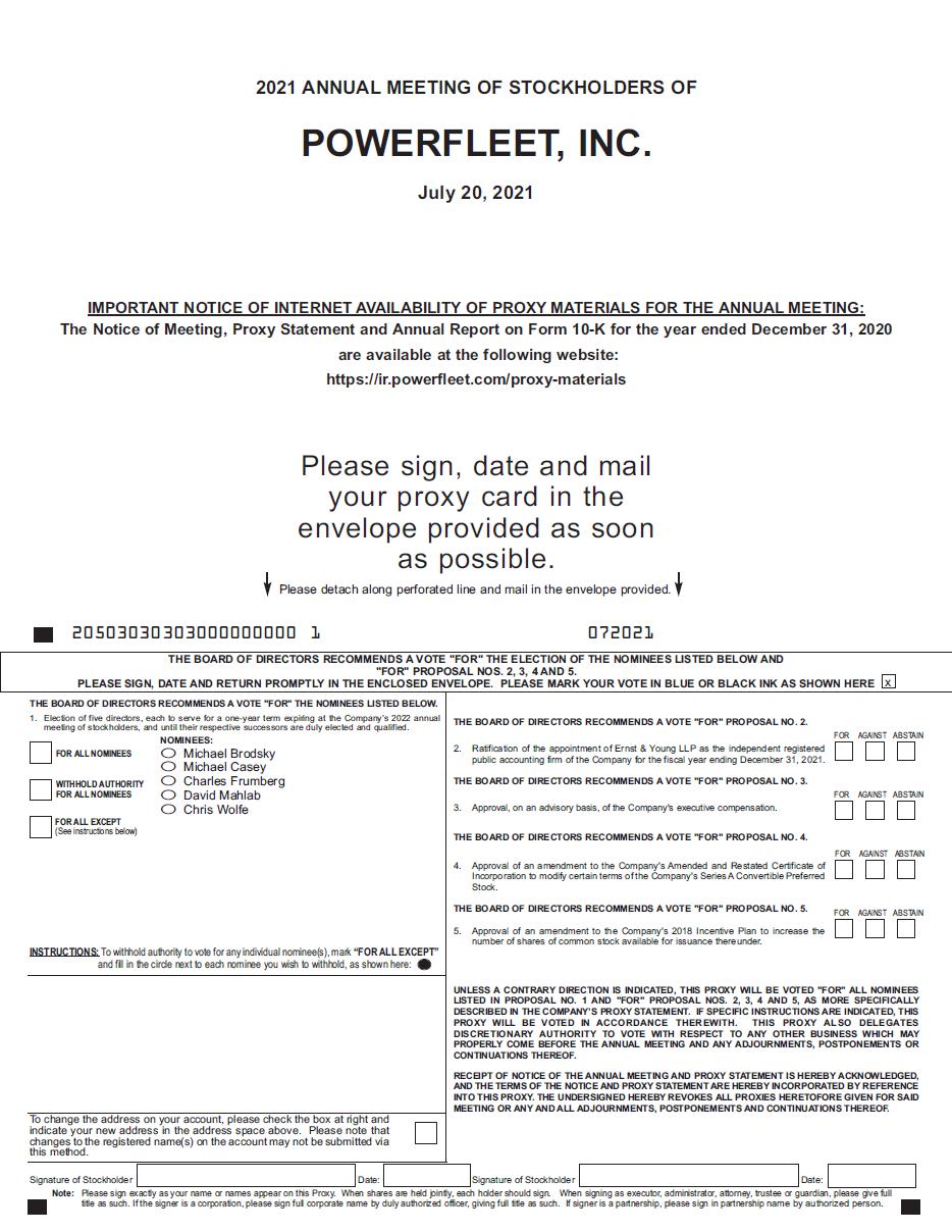 Important Notice of Internet Availability of Proxy Materials for the 2021 Annual Meeting of Stockholders to be held on July 20, 2021. The Notice, this Proxy Statement and our Annual Report on Form 10-K for the fiscal year ended December 31, 2020 (as amended by our Form 10-K/A filed with the Securities and Exchange Commission on April 30, 2021) are available through the Internet at https://ir.powerfleet.com/proxy-materials. Under Securities and Exchange Commission rules, we are providing access to our proxy materials both by sending you this full set of proxy materials, and by notifying you of the availability of our proxy materials on the Internet.