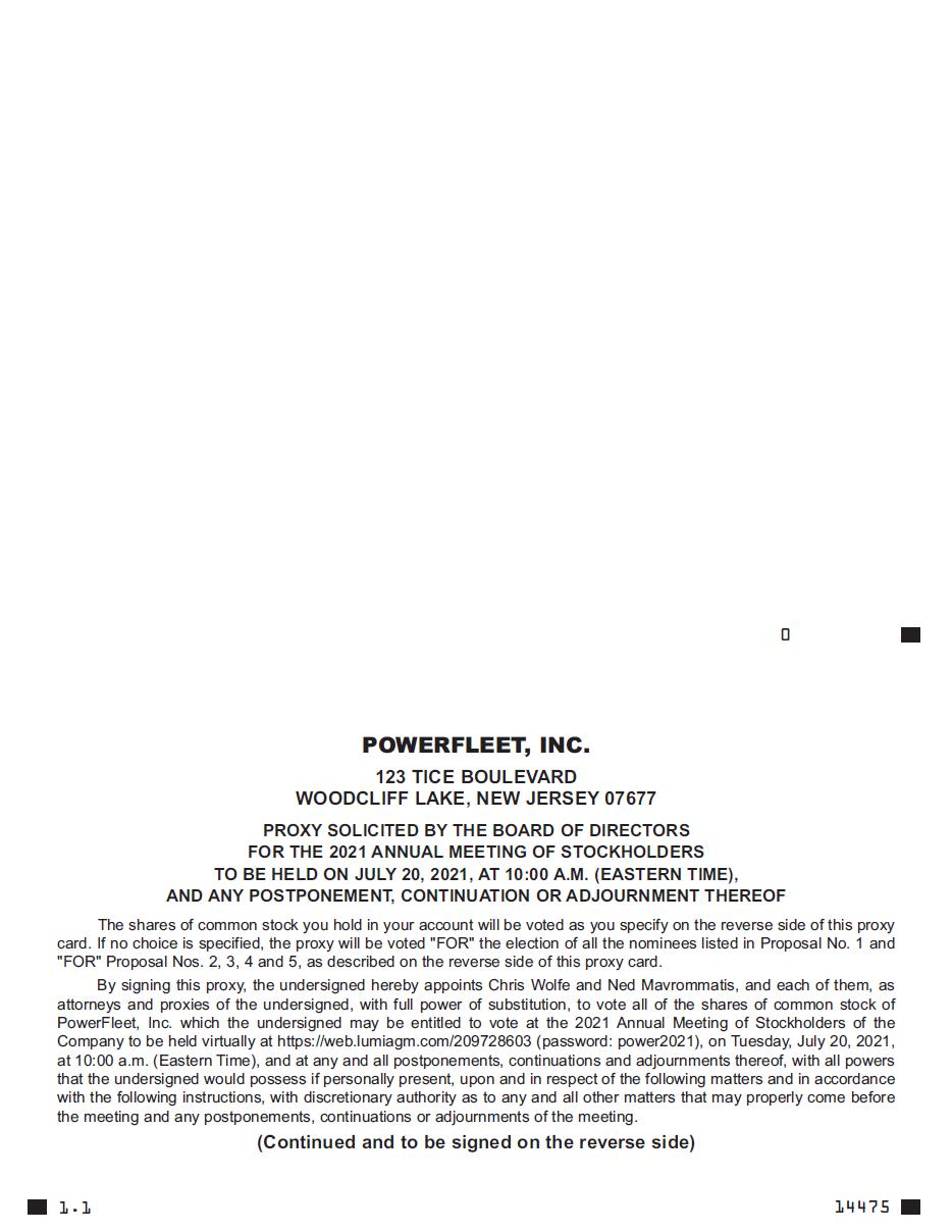 Notice is hereby given that the 2021 Annual Meeting of Stockholders (the “Annual Meeting”) of PowerFleet, Inc., a Delaware corporation (the “Company,” “we,” “our” or “us”) will be held on Tuesday, July 20, 2021, at 10:00 a.m., Eastern Time, and thereafter as it may be postponed or adjourned from time to time. Due to the public health impact of COVID-19, we will be holding our Annual Meeting in a virtual meeting format only. You may attend, vote and submit questions during the Annual Meeting via the Internet at https://web.lumiagm.com/209728603. The password for the meeting is power2021 (case sensitive). We have designed the format of the Annual Meeting to ensure that you are afforded the same rights and opportunities to participate as you would at an in-person meeting, using online tools to ensure your access and participation.