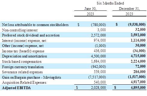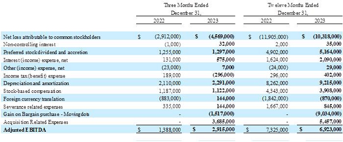 Adjusted EBITDA, a non-GAAP metric, inclusive of $3.9 million in operating expenses from Movingdots, totaled $6.9 million, compared to $7.3 million in 2022. See the section below titled “Non-GAAP Financial Measures” for more information about adjusted EBITDA and its reconciliation to GAAP net income (loss).