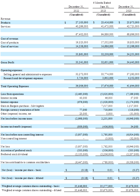 “As we promised shareholders when we embarked on this brave strategy of shuttering low-quality revenue streams, we duly returned to total revenue growth in the second half of 2023, with revenue and gross profit both increasing by 6% compared to the first half. Additionally, adjusted EBITDA in the second half of 2023 increased 141% compared to the first half, an impressive feat given a full period of Movingdots operating expenses, macroeconomic challenges in Israel, and a $1 million charge for inventory-related items in the fourth quarter.”