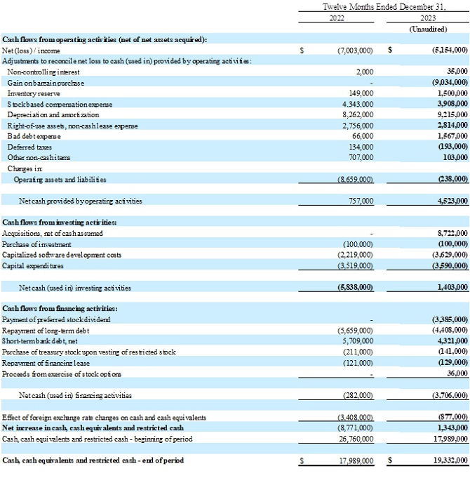 Operating expenses were $21.3 million, compared to $17.6 million in the same year-ago period. Excluding $3.7 million in non-recurring transaction expenses, Q4 2023 operating expenses of $17.6 million were in line with the prior year period. This performance reflects the company’s commitment to ensure Movingdots would be EBITDA neutral within two quarters of closing the transaction, with cut-to-cover activities absorbing $1.3 million of quarterly operating expenses incurred by Movingdots.