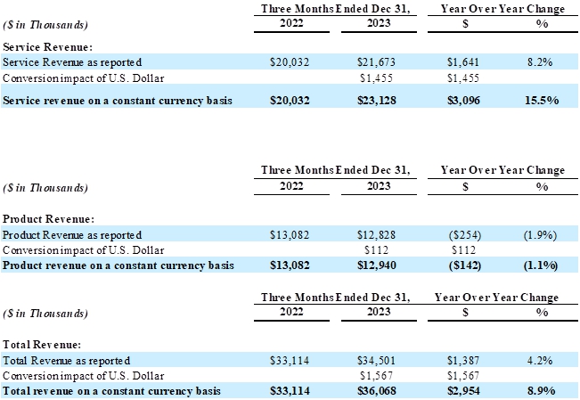 Total revenue was $34.5 million, compared to $33.1 million in the same year-ago period, an increase of 4% on an absolute basis and 9% on a constant currency basis. Service revenue was $21.7 million, up 8% on an absolute basis and 16% on a constant currency basis compared to the same year-ago period.