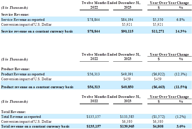 While total revenue was $133.6 million, compared to $135.2 million in 2022, underlying revenues increased by 4% on a constant currency basis. During 2023, the company actively shed approximately $8 million of product revenue from the business and replaced it with high-margin service revenue, which increased by 14% on a constant currency basis.