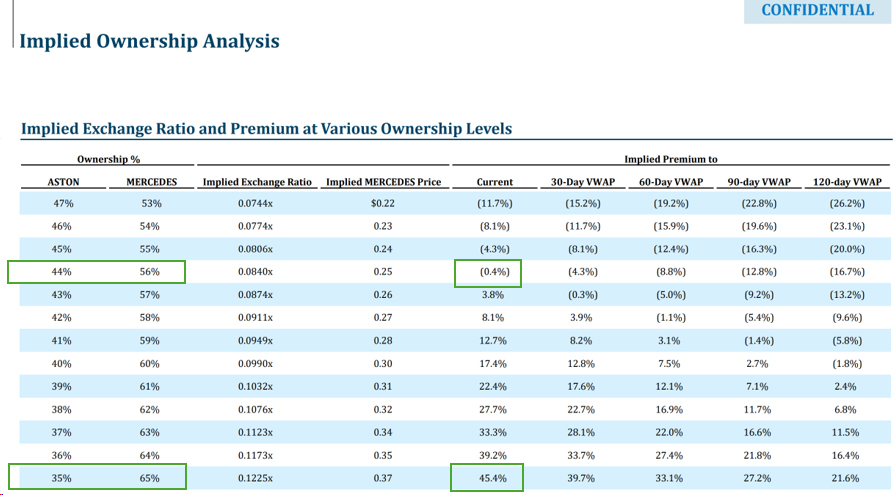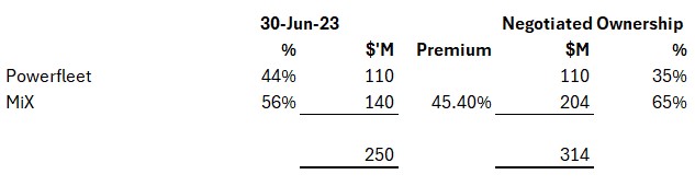 Please refer to the William Blair presentation in Appendix A which shows that based on the respective market prices as of June 30, 2023 the exchange ratio for each share of Powerfleet common stock compared to each MiX ordinary share would have been 0.0843 ($0.2528 MiX / $3.00 Powerfleet). As shown in the presentation the negotiated split combined with an implied premium led to an effective exchange ratio of 0.1225 which included the implied 45.4% premium based on the June 30, 2023 values. The exchange ratio was adjusted from the initial 0.1225 to the final 0.12762 following mutual due diligence conducted by both companies leading up to the October 10, 2023 signing and announcement of the transaction. This adjustment took into account changes in working capital levels and the impact of executive compensation in the form of restricted stock grants. As a result of this adjustment, the initial 65%/35% ownership split shown in Appendix A was modified to the final allocation of 65.5%/34.5%.