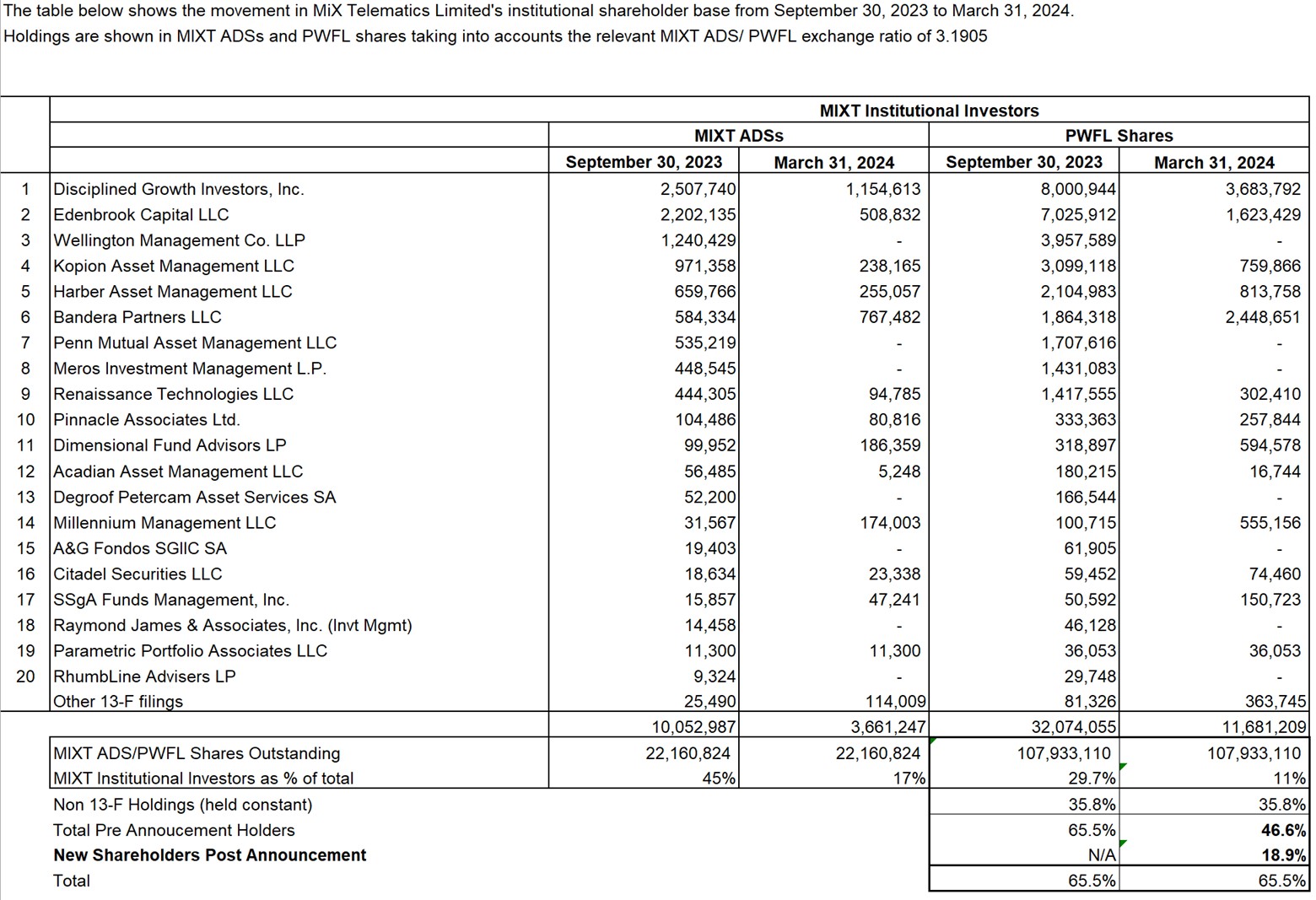 Additionally, the six-month period between the deal announcement on October 10, 2023, and the close on April 2, 2024, largely driven by the regulatory approval process in South Africa, saw a significant reduction in MiX’s institutional investor ownership. The Company notes that the combined shareholder group is largely composed of institutional investors. Immediately after the completion of the transaction, Powerfleet shareholders that were among the top 20 institutional investors held approximately 30.0% of the voting power of the combined entity, compared to approximately 9.0% held by former MiX institutional shareholders. Looking at all of MiX’s institutional investors, between September 30, 2023 and March 31, 2024, MiX’s institutional investors disposed of 28% (45% of shareholding reduced to 17%) of MiX’s total outstanding shares (see Appendix B for details). This significant turnover in institutional holdings within the MiX shareholder base between the deal announcement and close reduced MiX’s pre-announcement shareholders’ effective holdings from a theoretical 65.5% to an actual 46.6%. The difference (or turnover) of 18.9% represents the establishment of a new cohort of investors, distinguishable from the legacy MiX institutional investors who retained their stockholdings from the deal announcement date.